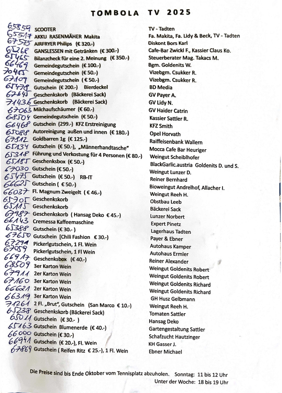 Wir gratulieren allen Gewinnern! Die Preise können bis Ende Oktober vom Tennisplatz abgeholt werden. Danke für die Unterstützung an alle Sponsoren die uns mit Sachpreisen und Gutscheinen unterstützt haben.